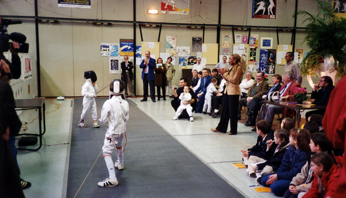 Cours d'escrime avec la championne olympique Laura Flessel, marraine de notre association en 2002. Share
